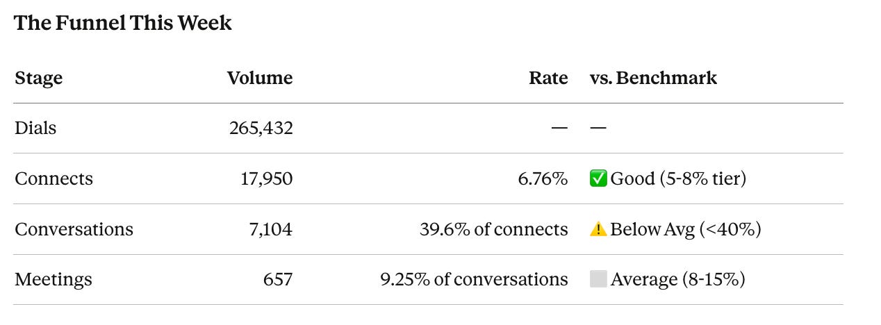 The Call Report is published weekly by Cold Call Benchmarks at Salesfinity.ai — the only cold-calling newsletter backed by data from 1000s of SDRs making millions of dials monthly. Got data you want analyzed? Reply to this email.
