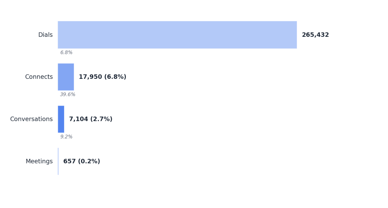 This week we 265,432 dials, which resulted in 17,950 live humans. Good. But only 7,104 of those connects became actual conversations. That’s a 39.6% connect-to-conversation rate, which means 60.4% of your live connects are dead on arrival — wrong contacts, gatekeepers, immediate hang-ups, or reps fumbling the first 8 seconds.