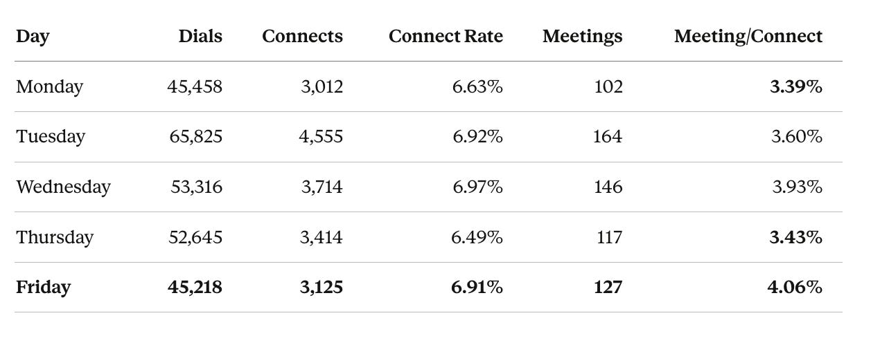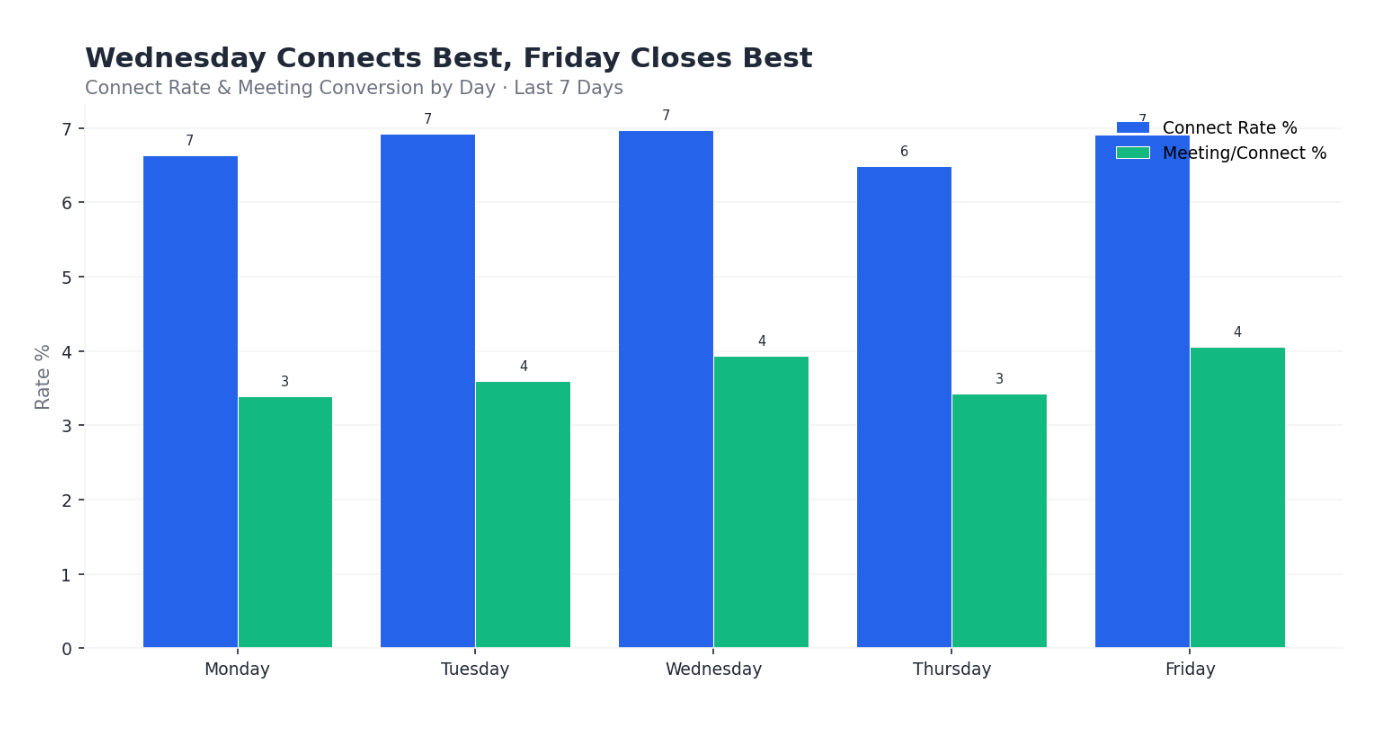 Yet Thursday and Friday get nearly identical dial volumes from teams. Shift 15% of Thursday’s volume to Friday. Thursday is the worst-performing day for meeting conversion — prospects are in mid-week meeting gridlock and screening calls. By Friday, they’ve cleared their calendar backlog and are in “close loops before the weekend” mode — more receptive to booking a quick call for next week.