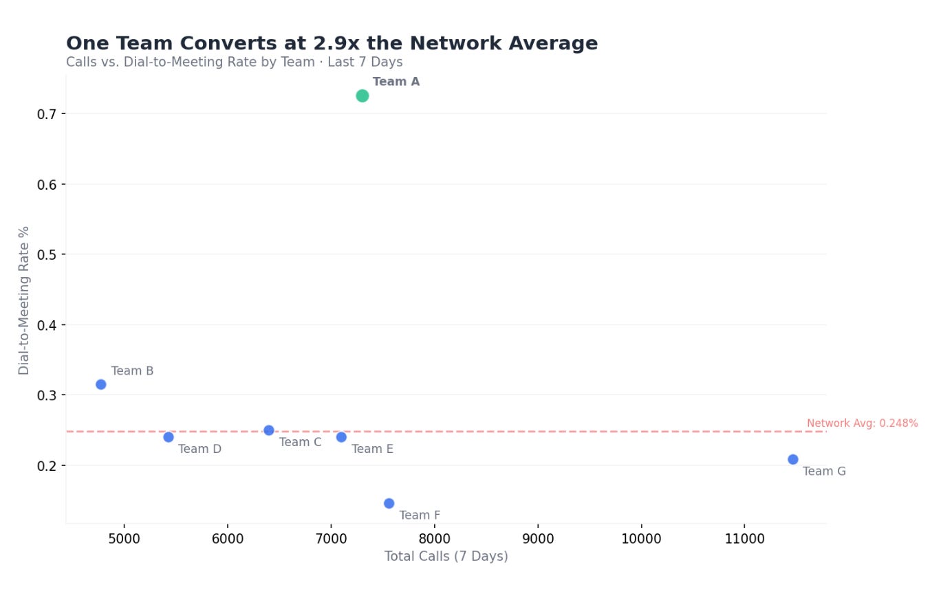 The Buried Signal: The gap between the best and worst teams on the platform is massive. The top 5% of teams are converting dials to meetings at 2.9x the network average — not because they dial more, but because they convert connects to conversations at dramatically higher rates. One top-performing team booked 53 meetings from ~7,300 dials (0.73% D2M) while a higher-volume team needed 11,400+ dials to book 24 meetings (0.21% D2M). Same platform, same week, 3.5x efficiency gap.