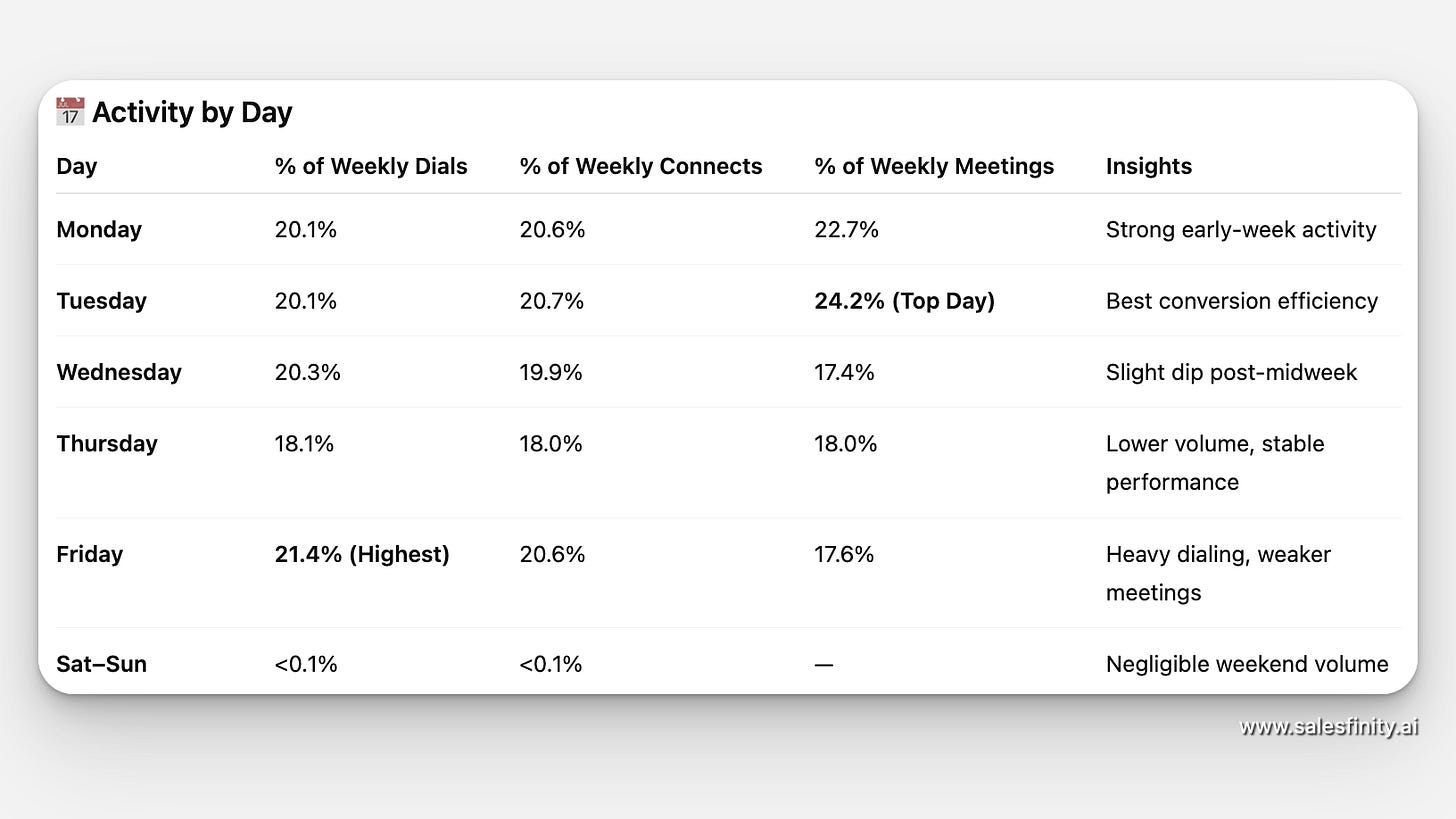 → Consistent rep engagement indicates sustainable outbound motion.